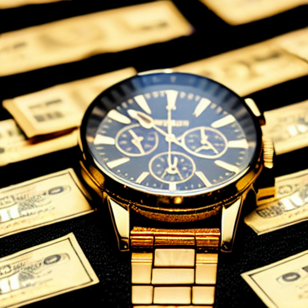 Gold Watch, Dollar bills, dark lighting, bricks