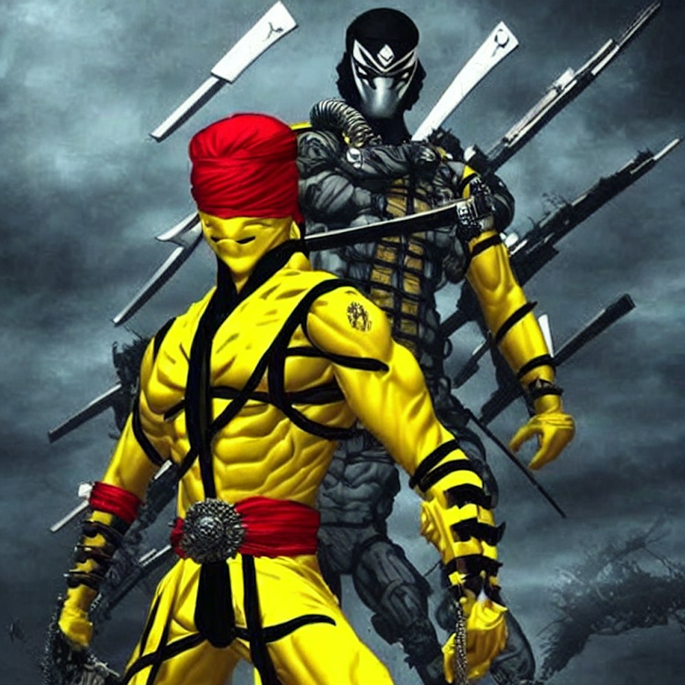India love Samurai ninja, yellow suit with red accents, style of Cyberforce. Storm shadow. Metal gear solid raiden. India love. Predator