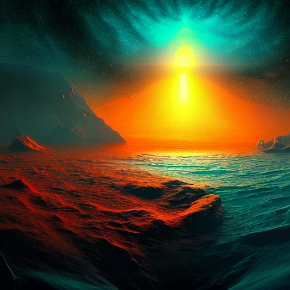 Alien planet, water, space, wideangle, cinematic lighting, fantasy, finely detailed, masterpiece, futuristic, photorealistic, orange