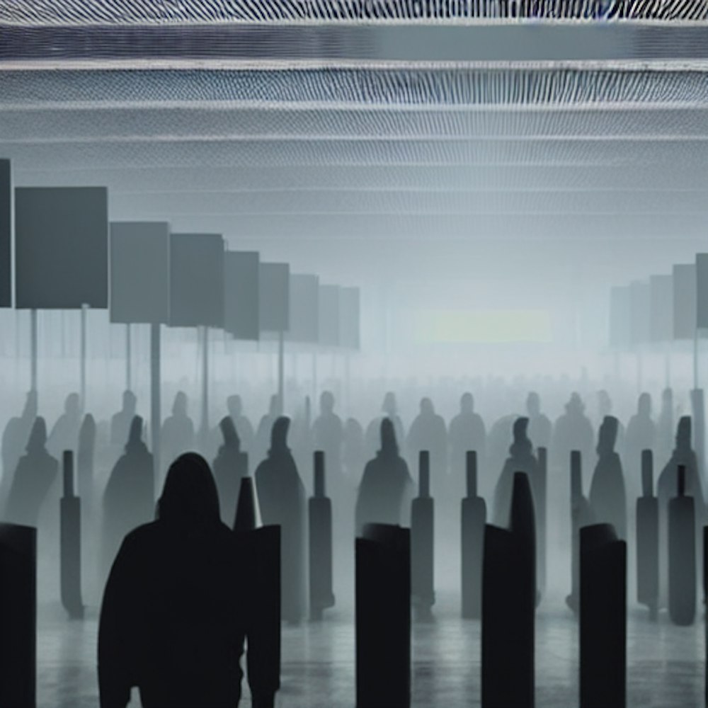 100 surrogates at a security checkpoint, futuristic, fog, multiple people, dystopian, photorealistic, photography, finely detailed