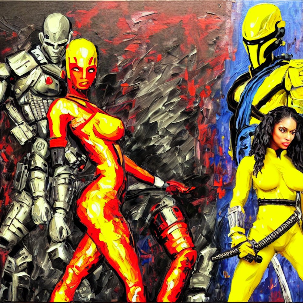 Bethany Benz Wide angle shot. Landscape. India love Samurai ninja, yellow suit with red accents, style of Cyberforce. Storm shadow. Metal gear solid raiden. India love. Predator. In combat. Bonnie rotten
