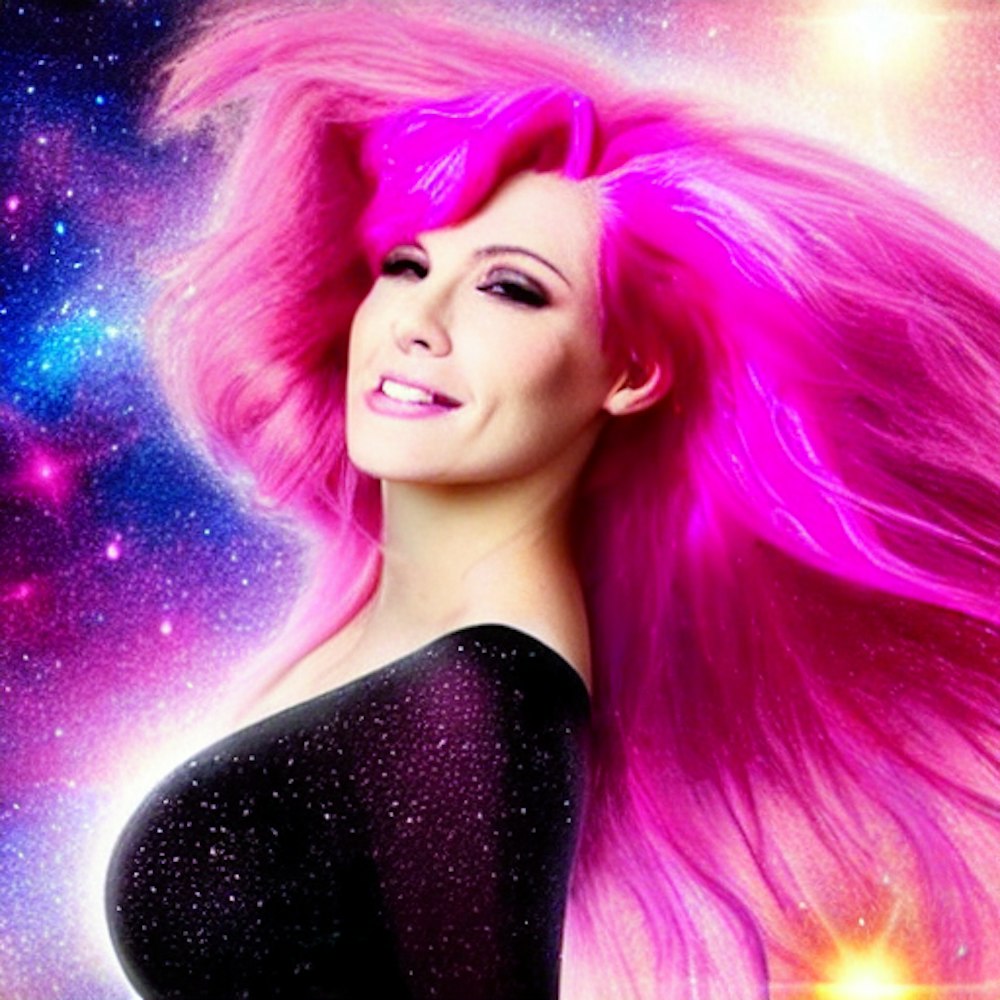 Pretty woman with pink hair laying in universe