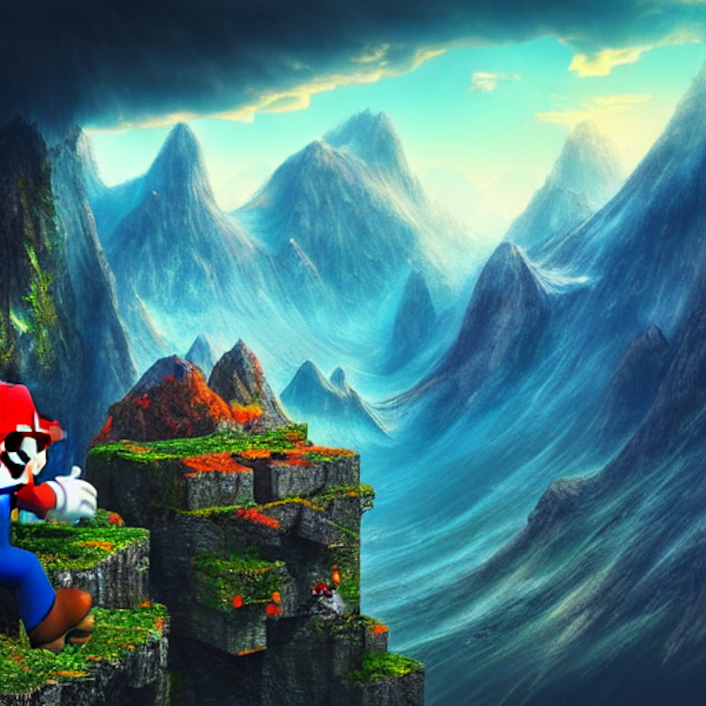 Mario, Moutains , cinematic lighting, hyper detailed, 50mm portrait, photorealistic, photography, futuristic