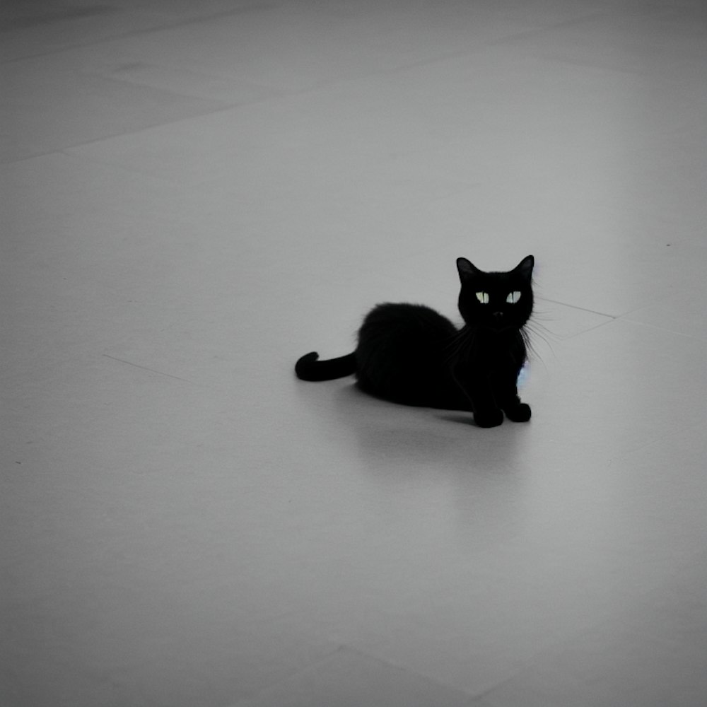 black cat, empty environment, white floor, black and white