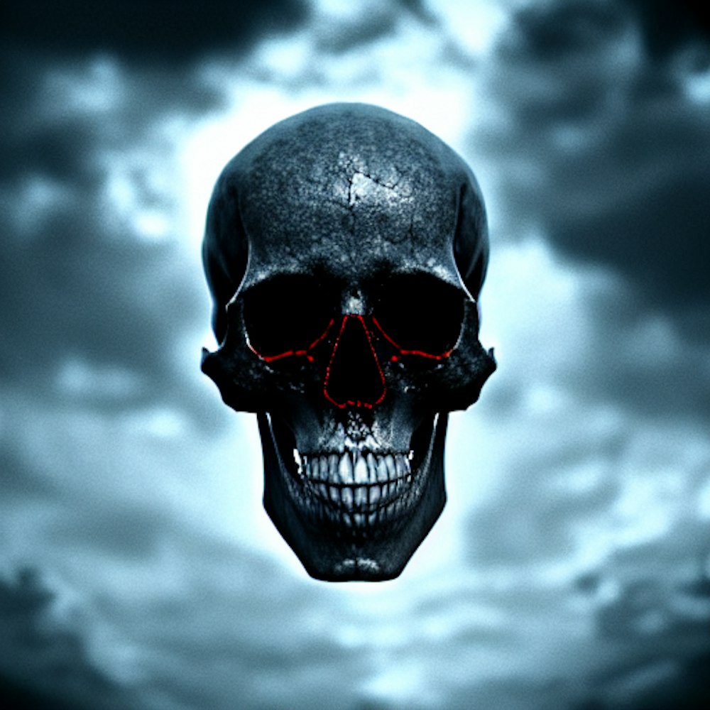 blood water floating skull in sky dark spooky, cinematic lighting, photorealistic, futuristic