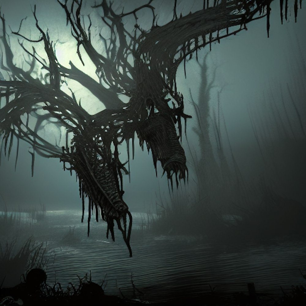 dark bloody water with skelton, hyper detailed, cinematic lighting, fog,