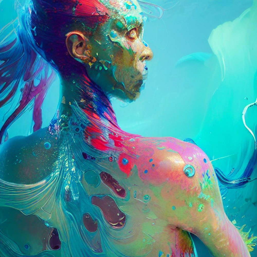Insanely detailed photographic portrait of a brightly-colored water elemental ocean waves women bare back, an intricate and hyperdetailed painting by Ismail Inceoglu, Huang Guangjian CGSociety, ZBrush Central, fantasy art, album cover art