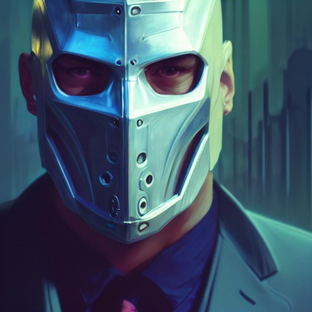 Guy in a mask and suit, 50mm portrait, finely detailed, cinematic lighting, futuristic