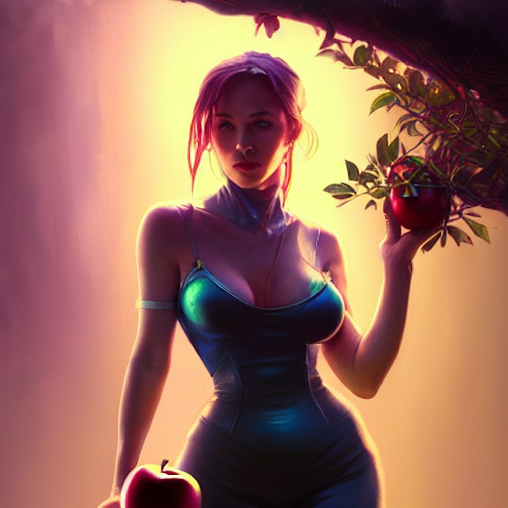 hot girl next to an apple tree holding an apple