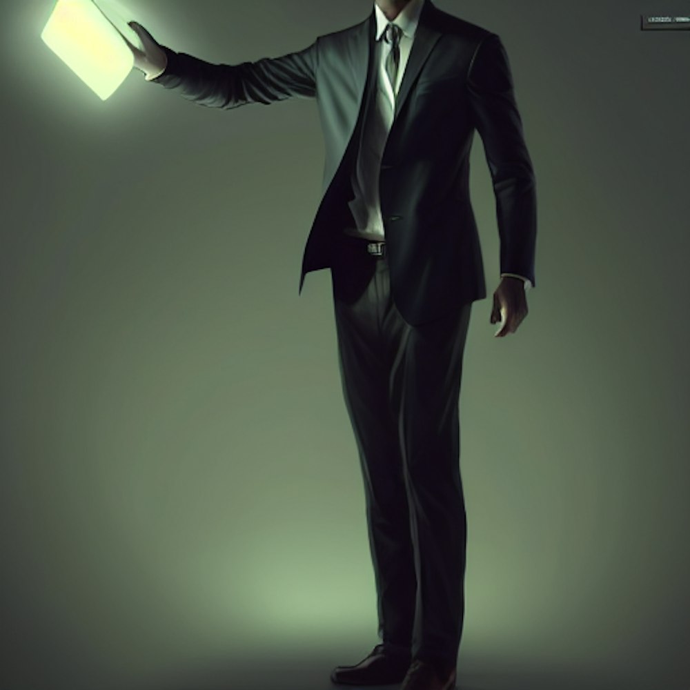 Faceless guy in a suit, intriguing, photorealistic, hard rim lighting