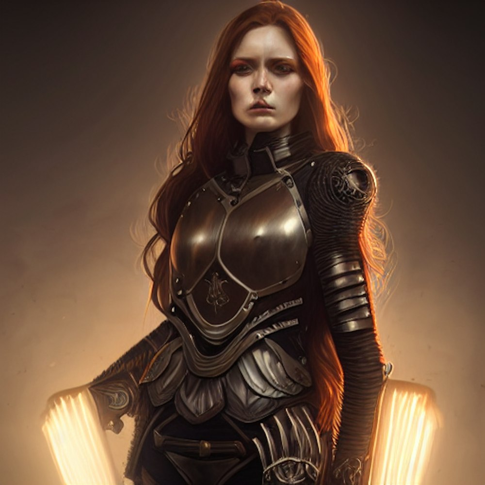 American Woman aged 25, flowing chestnut colored hair, intricate suit of black armor, cinematic lighting, fantasy, serious eyes, intricate design, cel-shaded, steampunk, photorealistic, 50mm portrait
