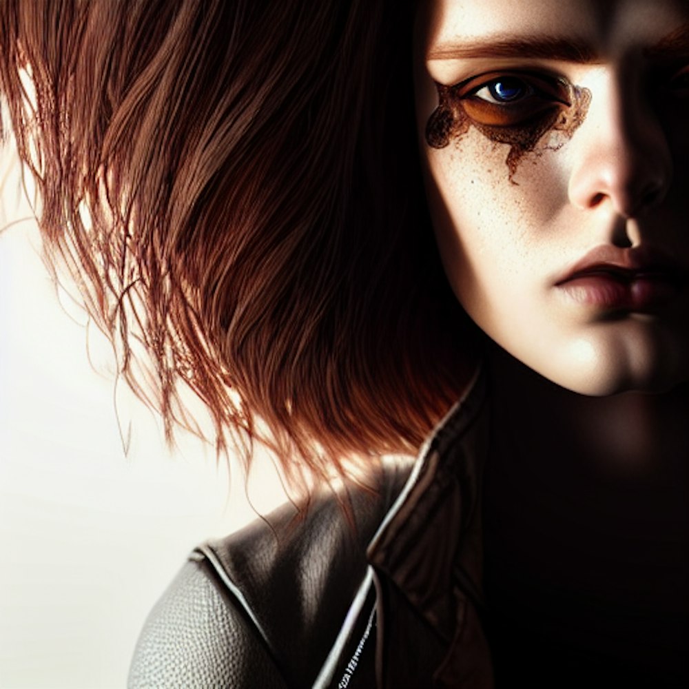 American Woman aged 25, flowing chestnut colored hair, white tee, black leather jacket, cinematic lighting, serious eyes, intricate design, cel-shaded, 50mm portrait