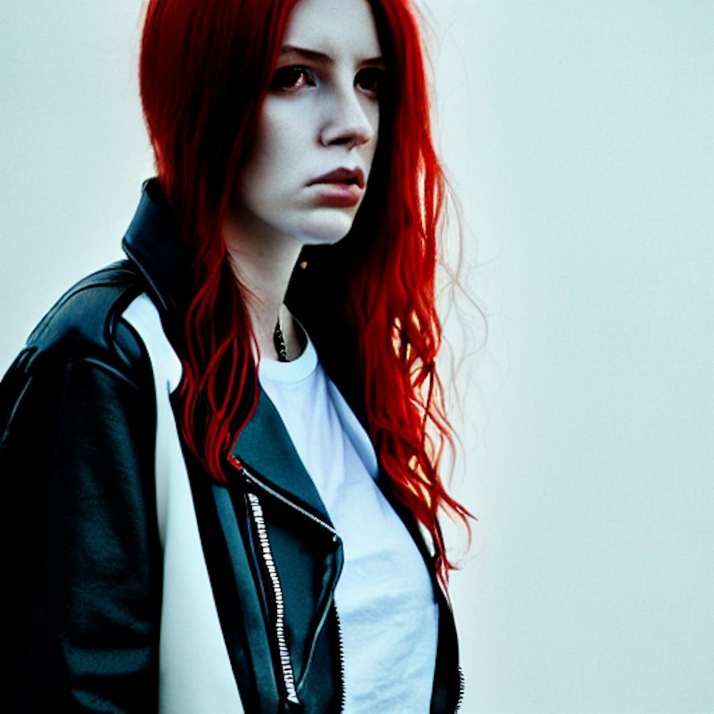 Woman, 25, red hair, black biker jacket, white tee shirt, jeans, sneakers, , cel-shaded, 50mm portrait, cinematic lighting