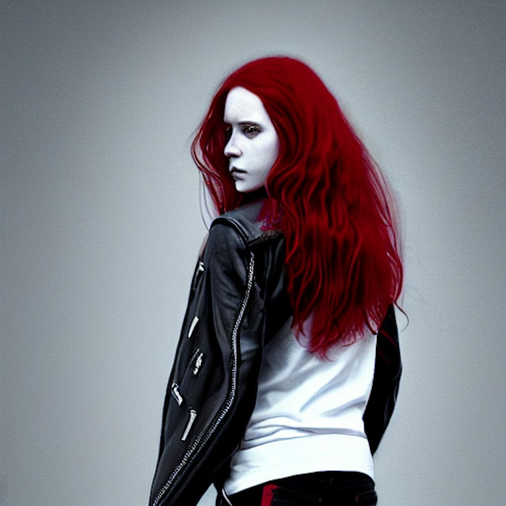 Woman, 25, red hair, black biker jacket, white tee shirt, jeans, sneakers, 50mm portrait, cinematic lighting, hyper detailed, photorealistic