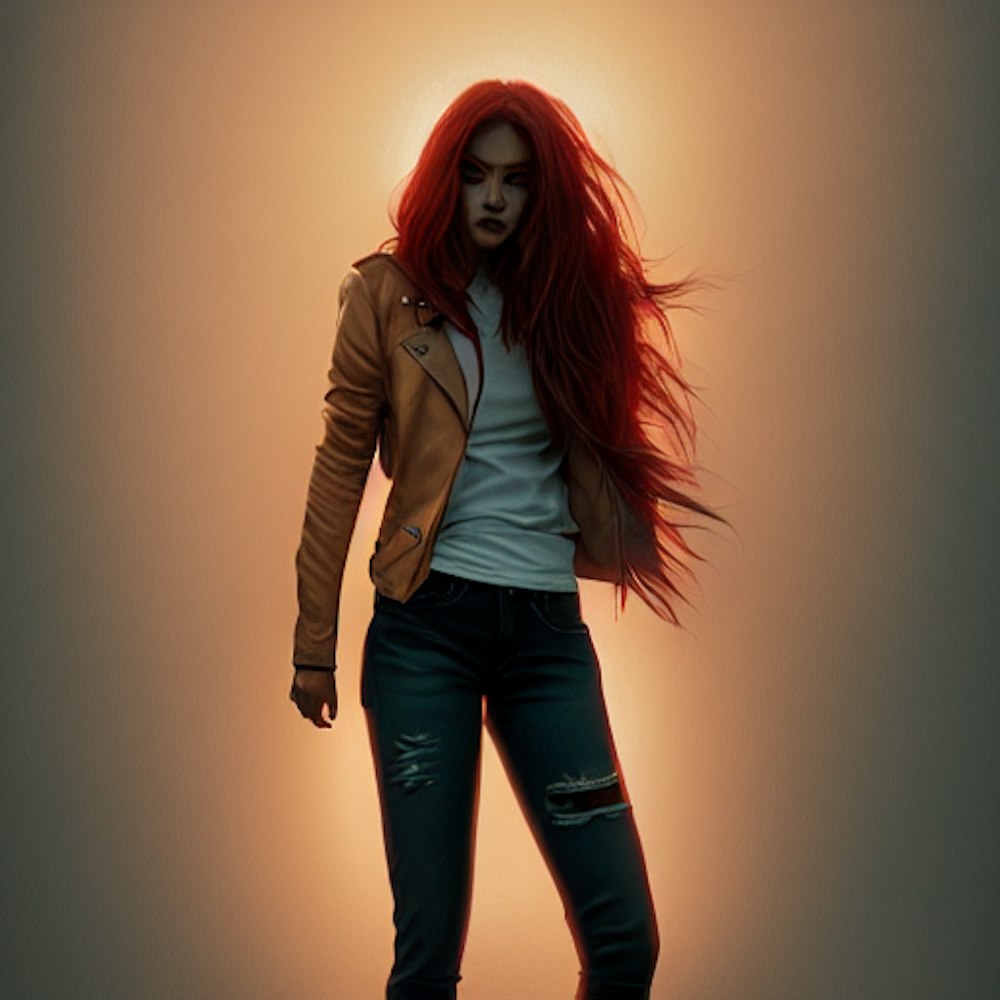 Woman, 25, tan skin, red hair, black biker jacket, white tee shirt, jeans, sneakers, 50mm portrait, cinematic lighting, hyper detailed, photorealistic, large breasts