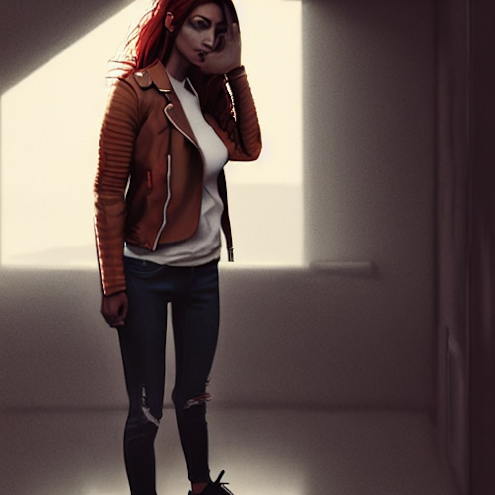 Woman, 25, tan skin, red hair, black biker jacket, white tee shirt, jeans, sneakers, cinematic lighting, hyper detailed, photorealistic