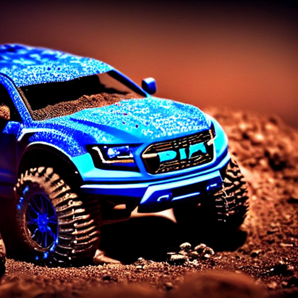 Blue Ranger raptor Ute jumping on dirt , finely detailed, photorealistic, photography, intricate design, hyper detailed, masterpiece, intriguing, cinematic lighting, concept art, serious eyes, fog, cel-shaded, soft lighting, hard rim lighting