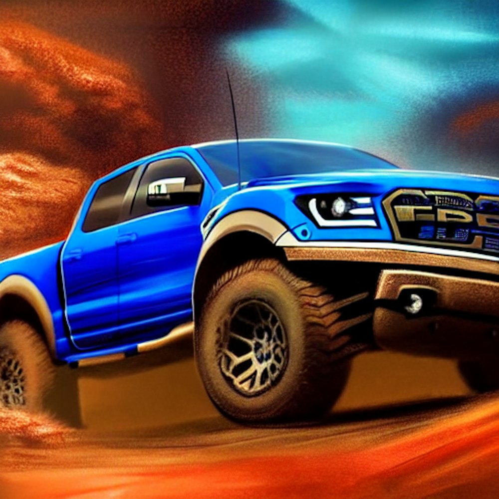 Blue Ranger raptor Ute jumping on dirt , colourful finely detailed, photorealistic, photography, intricate design, hyper detailed, masterpiece, intriguing, cinematic lighting, concept art, serious eyes, fog, cel-shaded, soft lighting, hard rim lighting