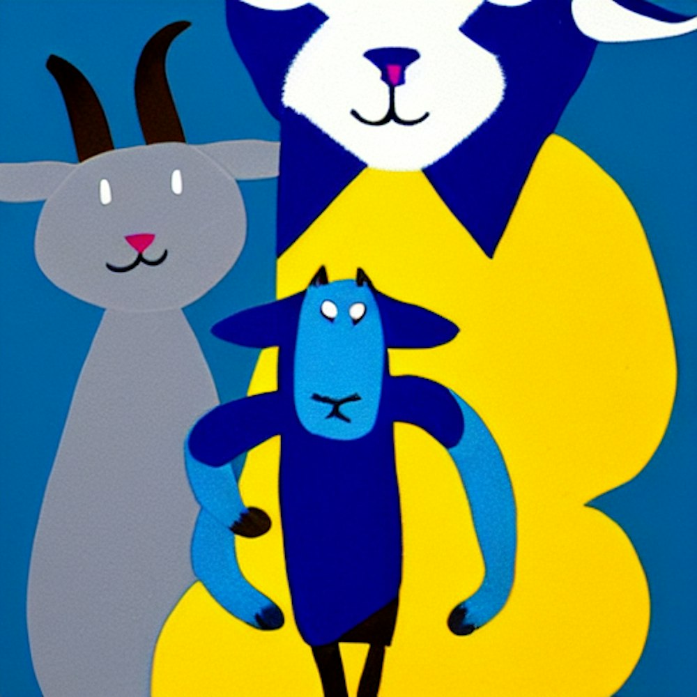 Blue cat with a yellow jacket and a goat sitting next to the cat