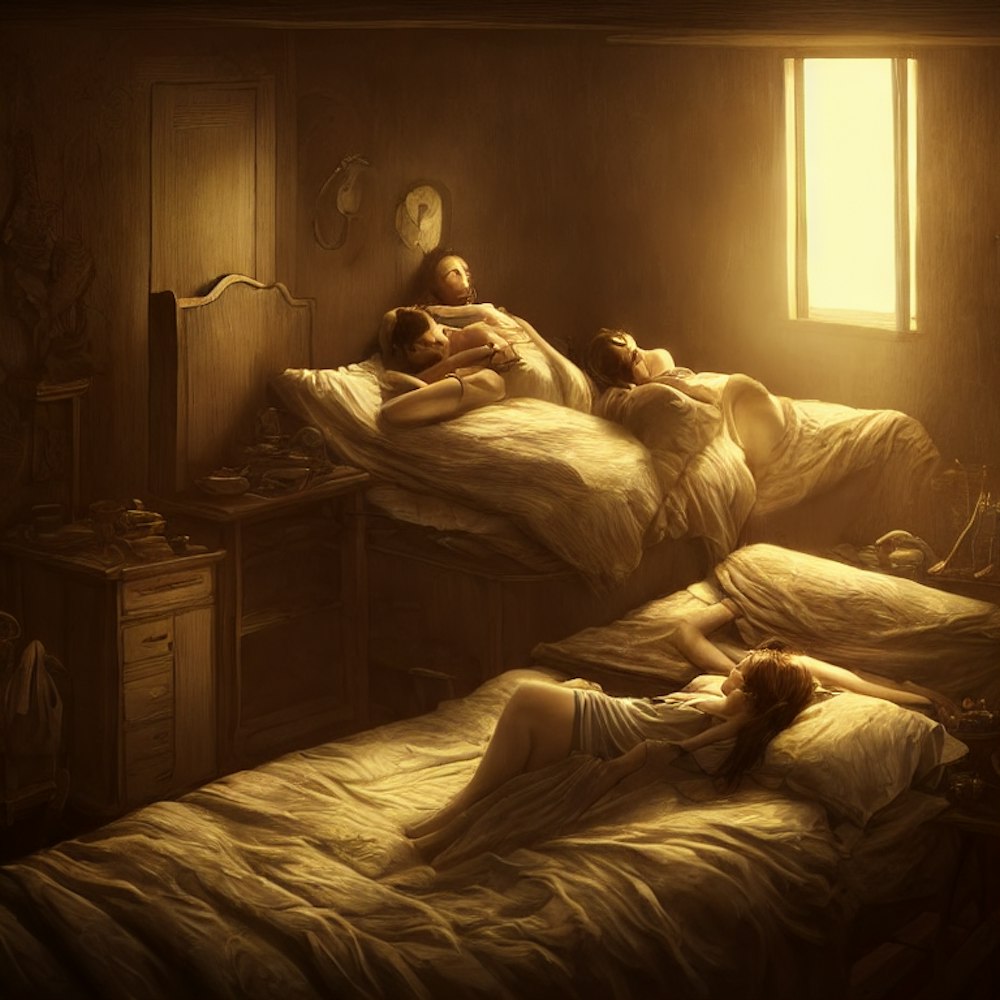 guy and girl sleeping in separate rooms but are dreaming together�