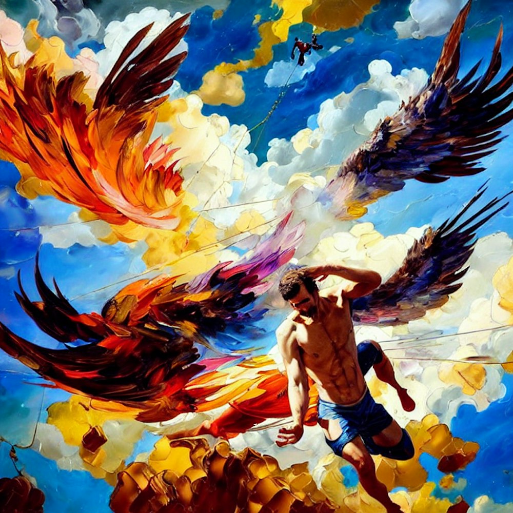 An emotional oil painting capturing the tragic tale of Icarus, showcasing him plummeting from the sky as his wings melt. Vibrant colors, expressive brushstrokes, dramatic composition, intense emotions, allegorical., olpntng style, akihiko yoshida, greg tocchini, greg rutkowsk, oil painting, heavy strokes, paint dripping