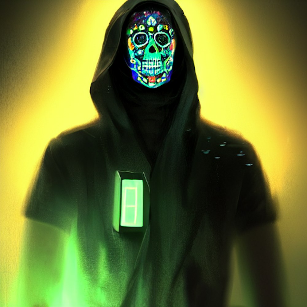 Black Metallic skull mask, neon, dia de los muertos, cloaked figure, running through city streets, cyberpunk,