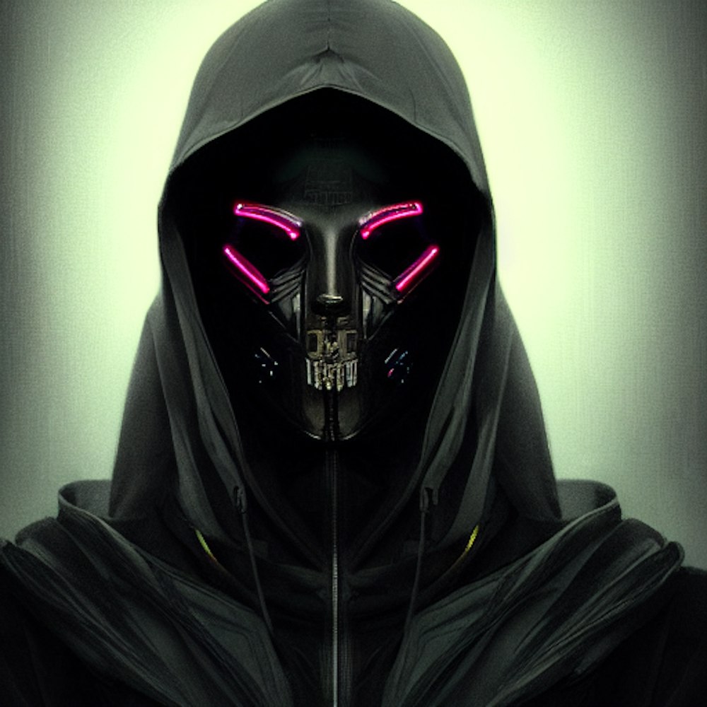 Black Metallic neon skull mask, cloaked figure, running through city streets, cyberpunk,