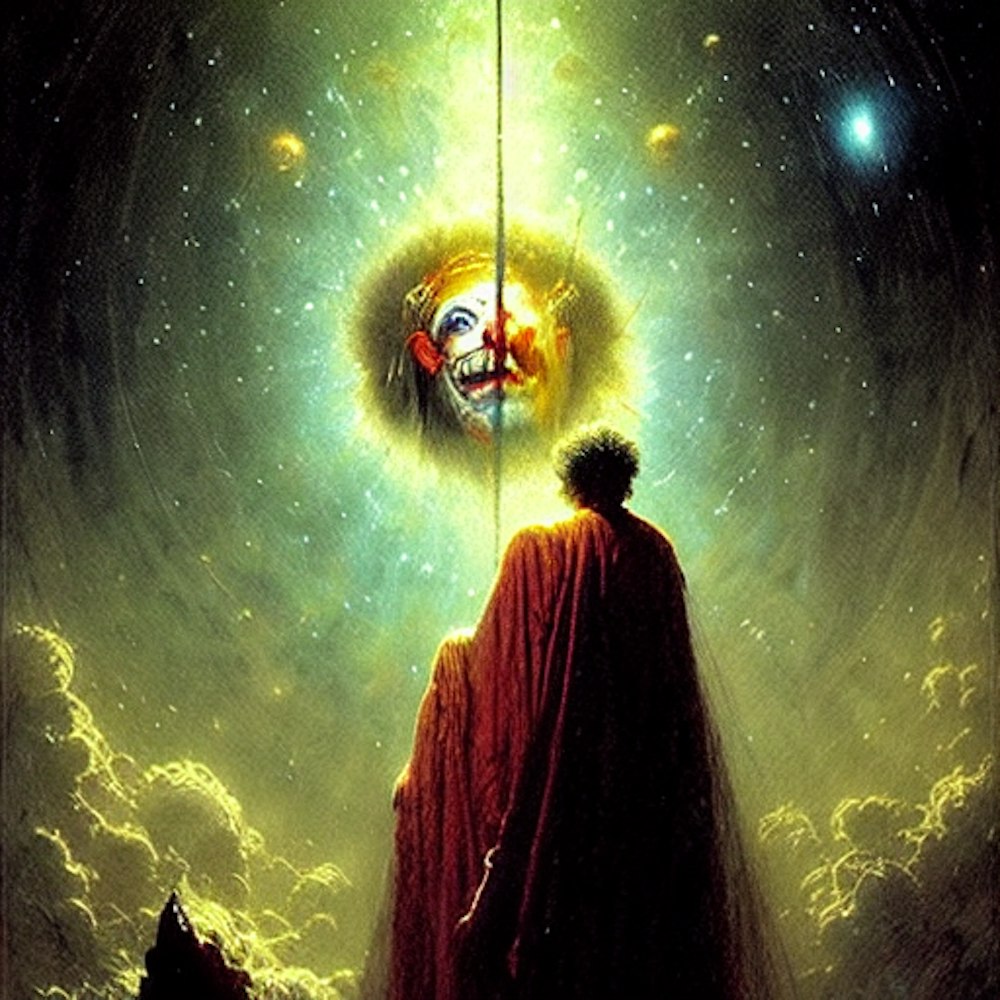 Evil clown of creation, heaven, surreal, space, light rays, galaxy, space, stars, comet, horror Gustave Doré Greg Rutkowski,