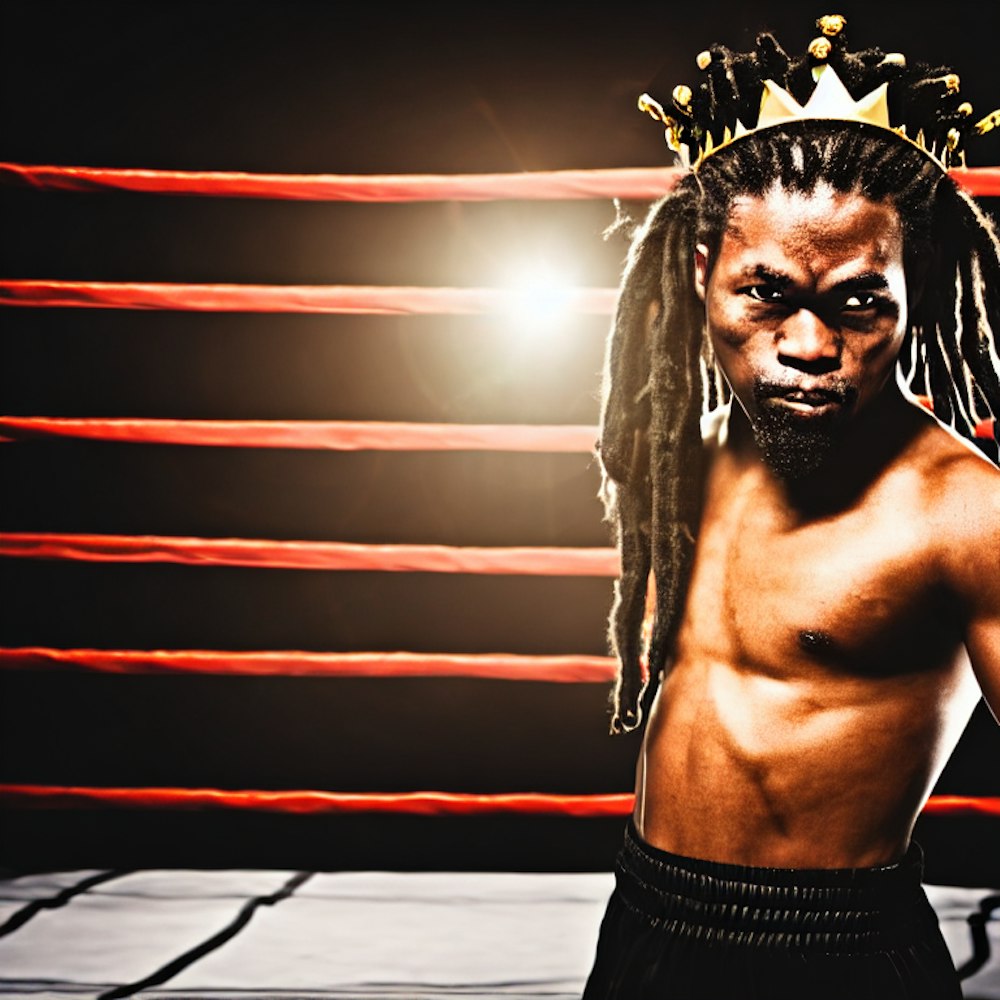 a empty boxing ring with a black samurai with dread wearing a gold crown in the corner