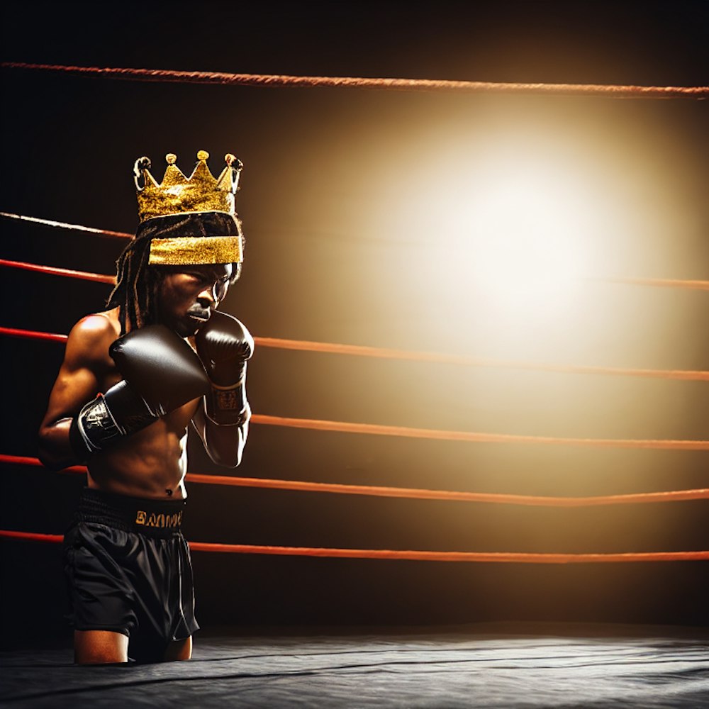 a empty boxing ring with a black samurai with dread wearing a gold crown in the corner