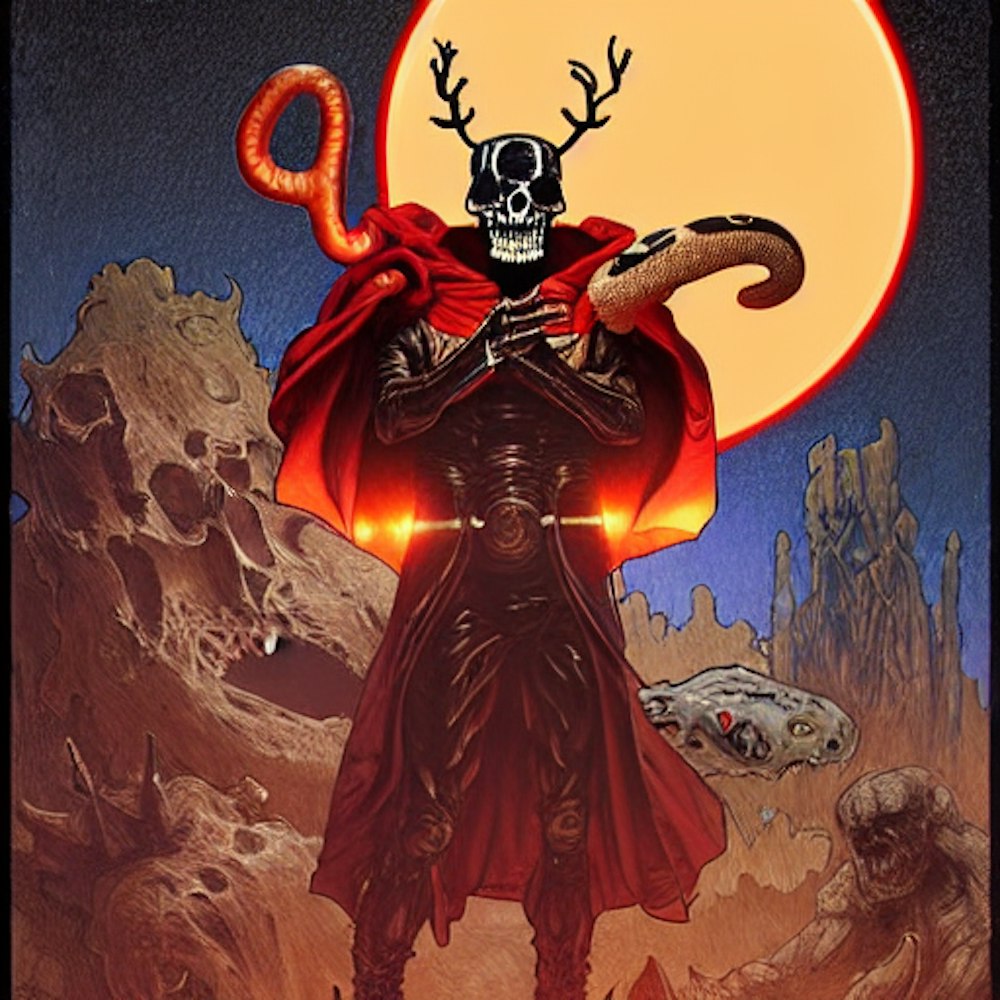 Doom in a red cape, skull face, orange antlers, black staff with snake wrapped around, desert. intricate, Centered. Dittmann, Artgerm, WLOP, Mucha. Concept art. Planets, Space. Dynamic lighting. Regal. Bagshaw, Chevrier, Ferri, Kaluta, Minguez, Johansson
