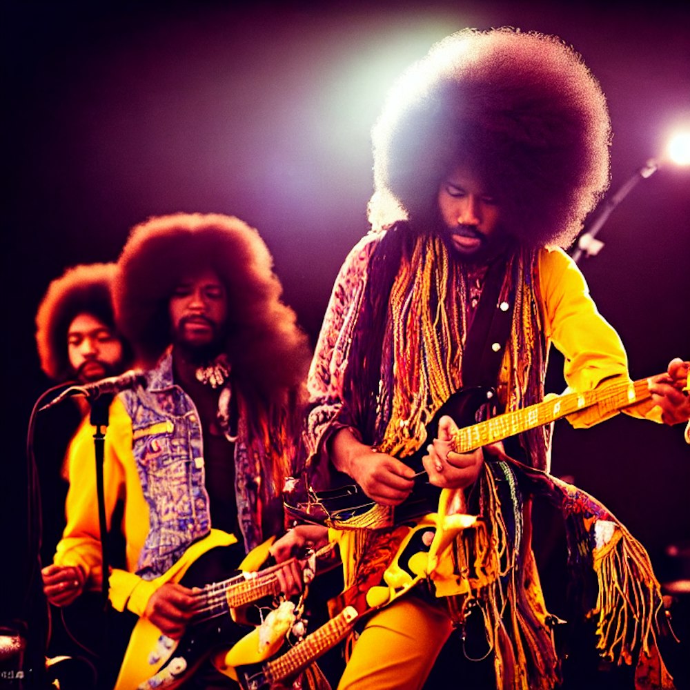 Black hippies with afros American Psychedelic rock band quartet, drums, bass, lead guitar, rhythm guitar, live on stage, 1970