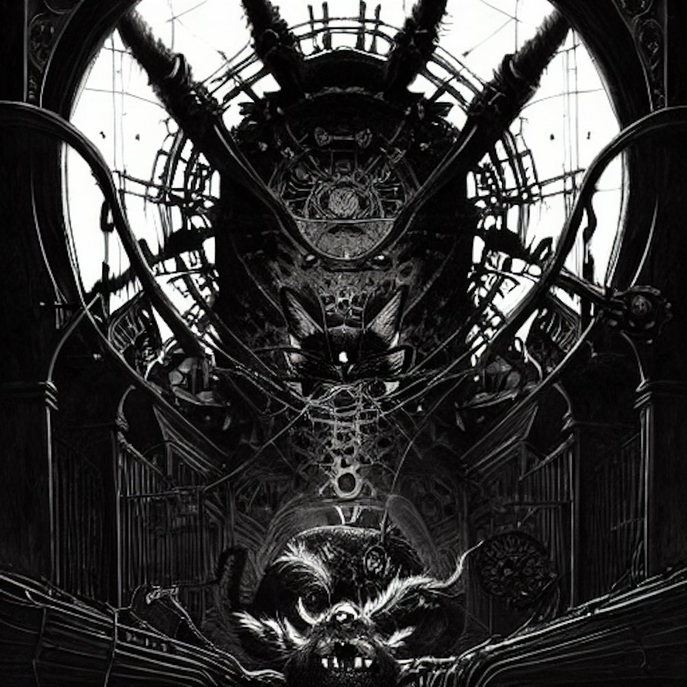 Black cat, monster,, steampunk, hyper detailed, intricate design spider,fire