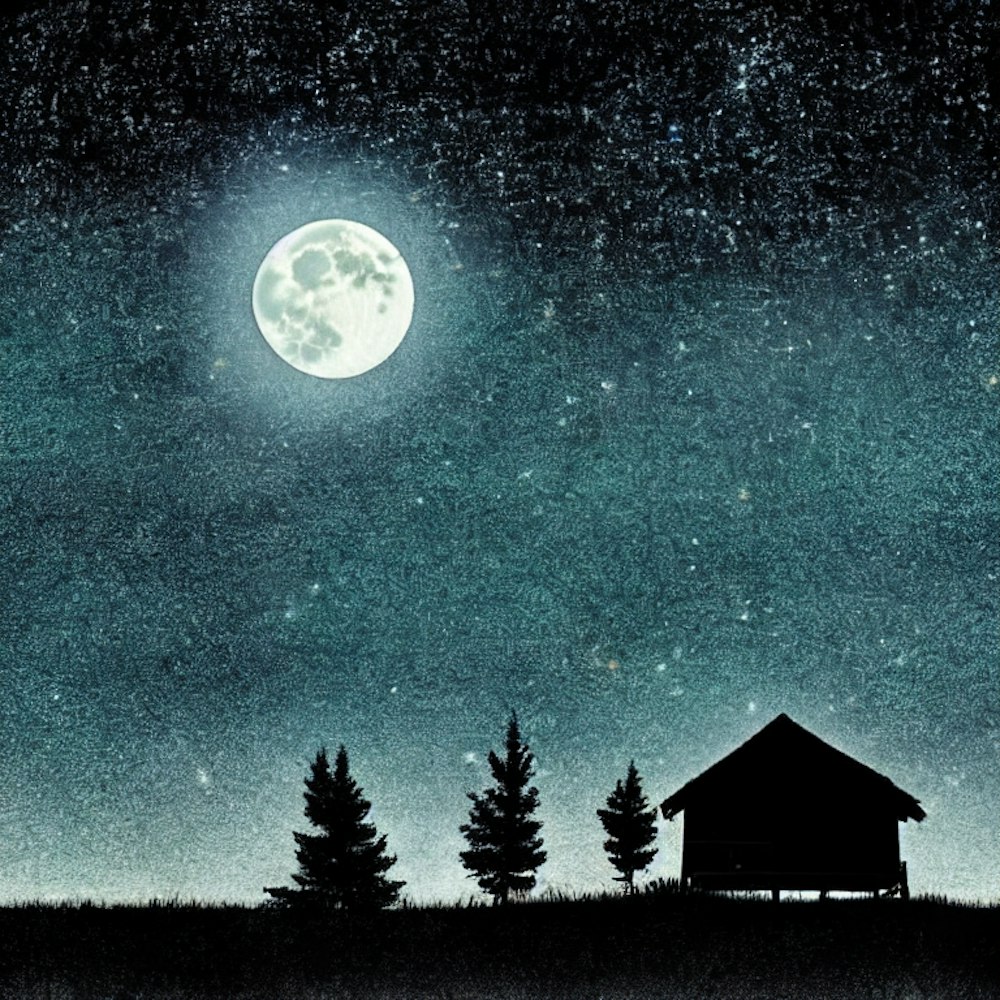 Silhouette of a tree against a starry night sky with a full moon and clouds and a wooden cabin. song album theme