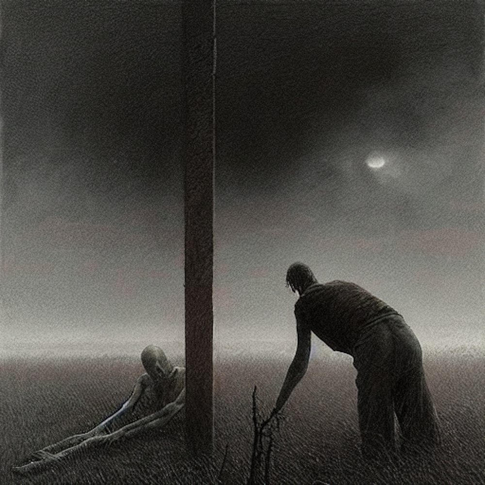 Night, farm, dead body on ground, bloody, farm, by Dario Puggioni, Bom.K, Ally Burke, Zdzislaw Beksinski