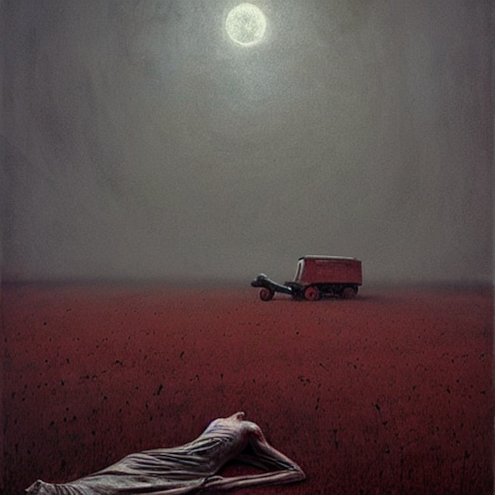 Night, farm, dead body on ground, bloody, farm, by Dario Puggioni, Bom.K, Ally Burke, Zdzislaw Beksinski