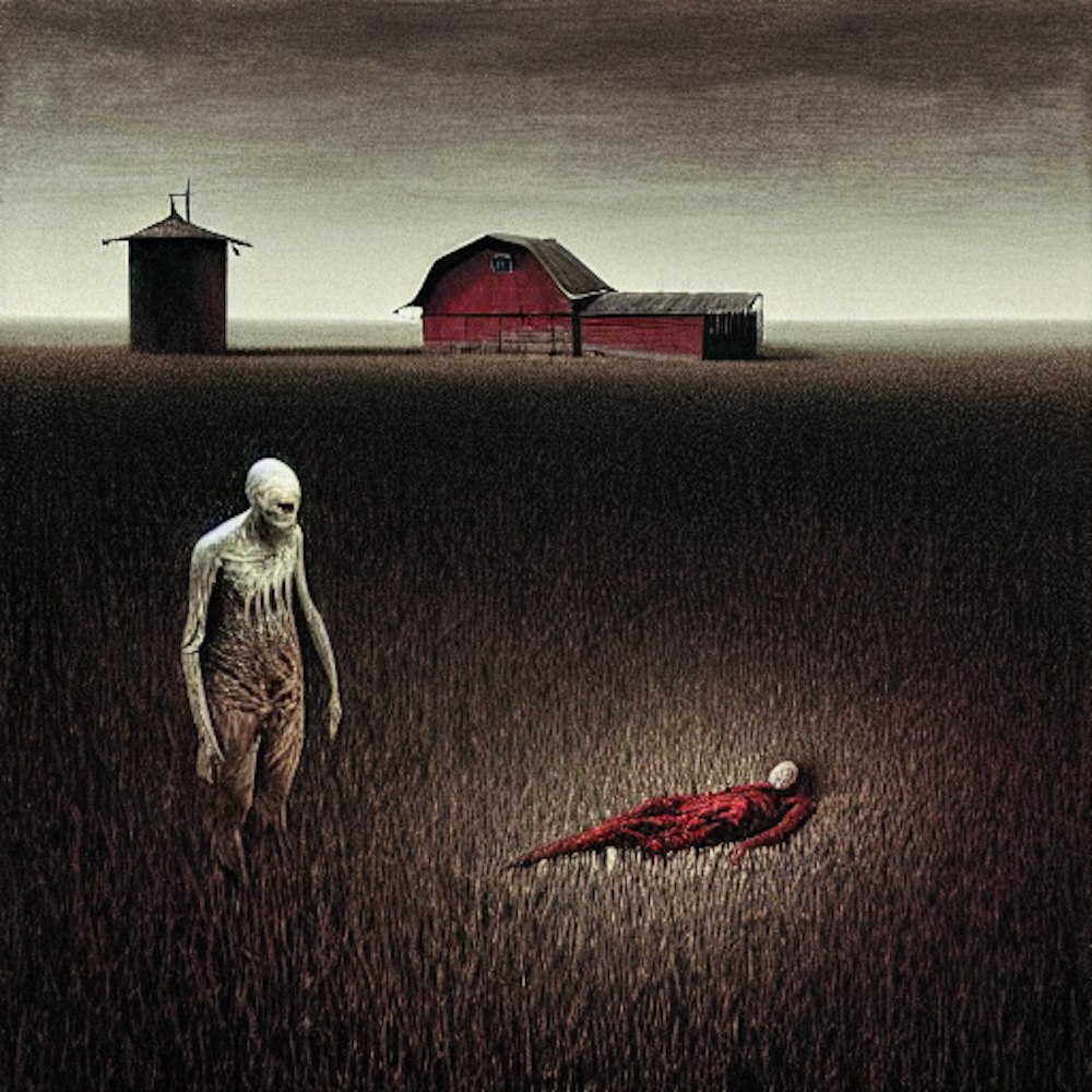 Night, farm, dead body on ground, bloody, farm, by Dario Puggioni, Bom.K, Ally Burke, Zdzislaw Beksinski
