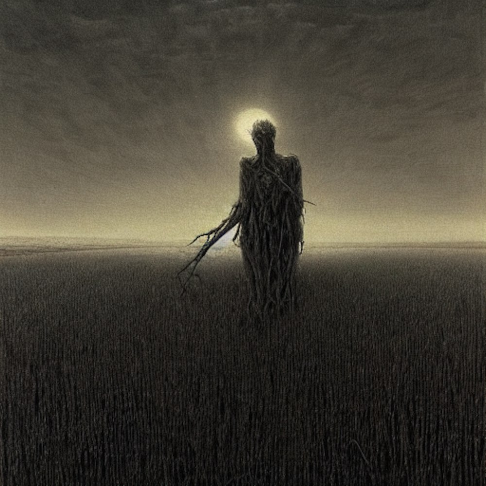 Night, farm, dead body on ground, bloody, farm, by Dario Puggioni, Bom.K, Ally Burke, Zdzislaw Beksinski