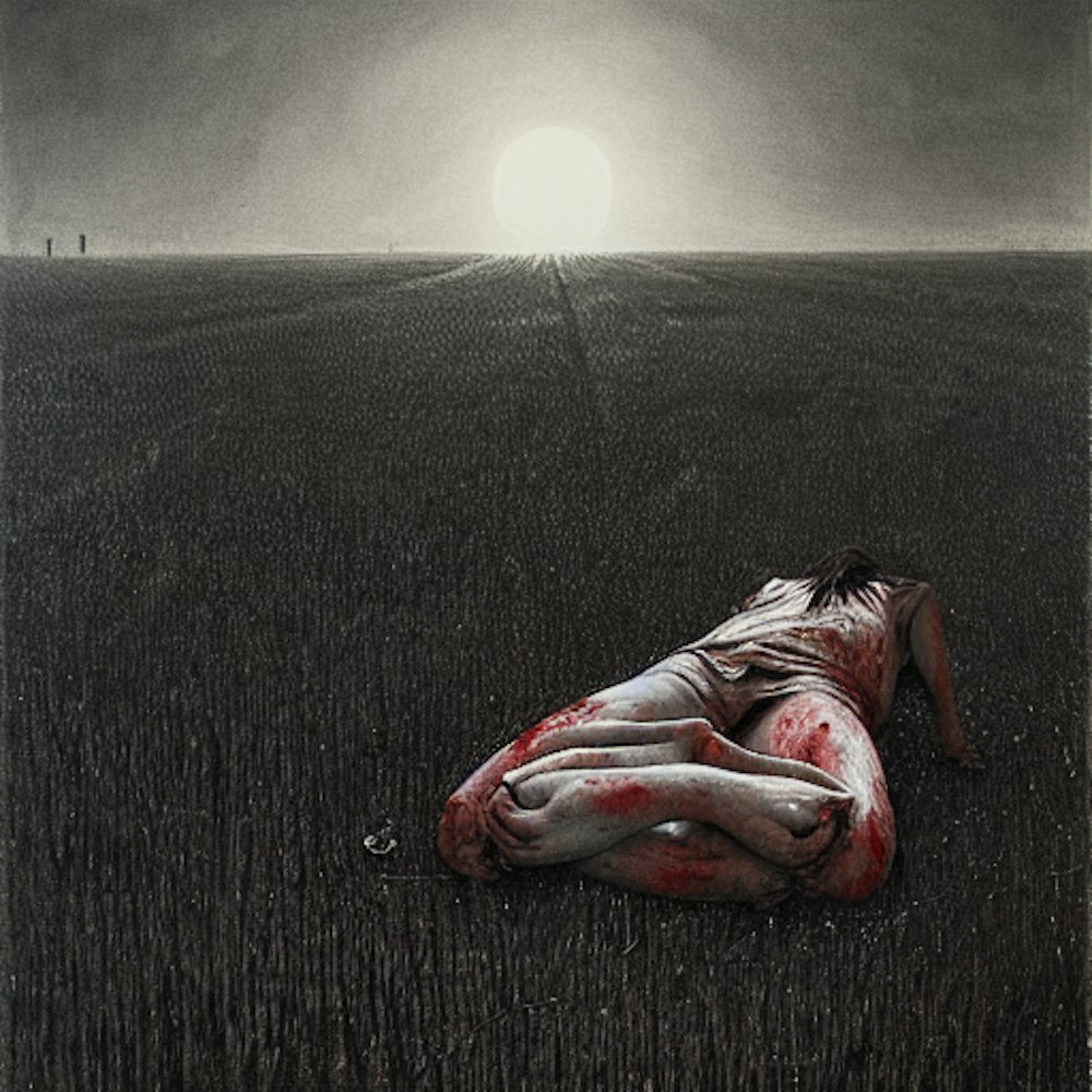 Night, farm, dead body on ground, bloody, farm, by Dario Puggioni, Bom.K, Ally Burke, Zdzislaw Beksinski