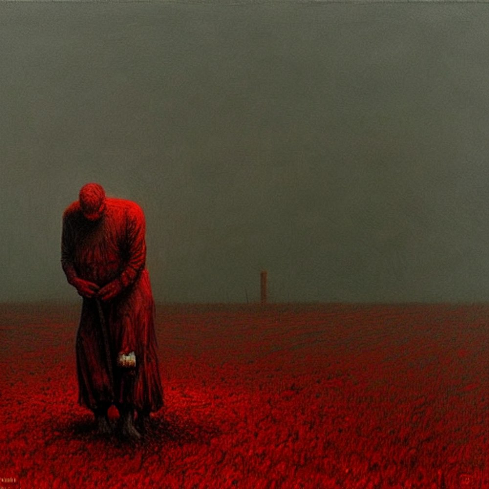 Night, farm, dead body on ground, bloody, farm, by Dario Puggioni, Bom.K, Ally Burke, Zdzislaw Beksinski