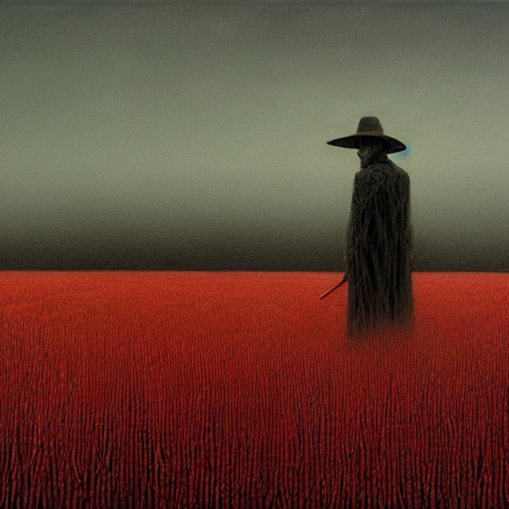 The mysterious stranger, bloody, farm, corn field by Dario Puggioni, Bom.K, Ally Burke, Zdzislaw Beksinski