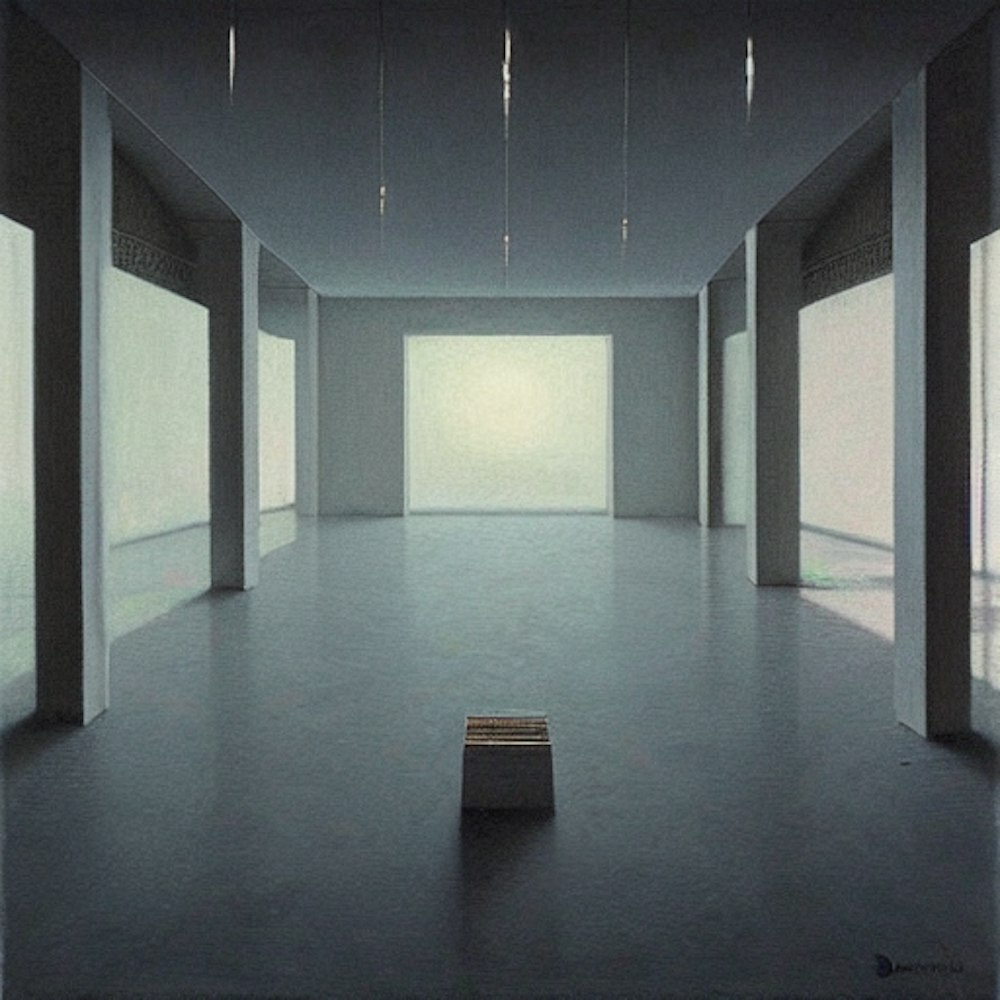 Infinite empty apartment complex, night, by Dario Puggioni, Bom.K, Ally Burke, Zdzislaw Beksinski