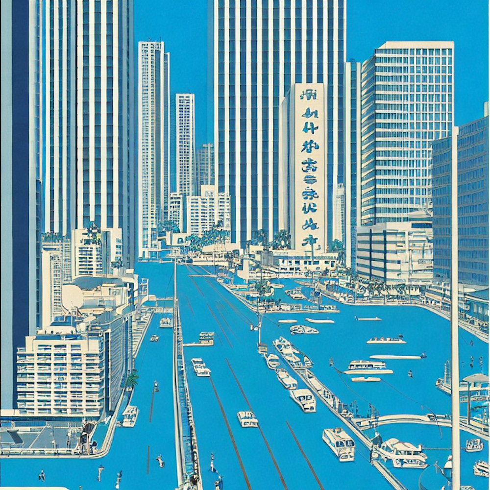 los angeles architecture in hiroshi nagai art style, shades of blue and brown, tropical, beachside, cityscape