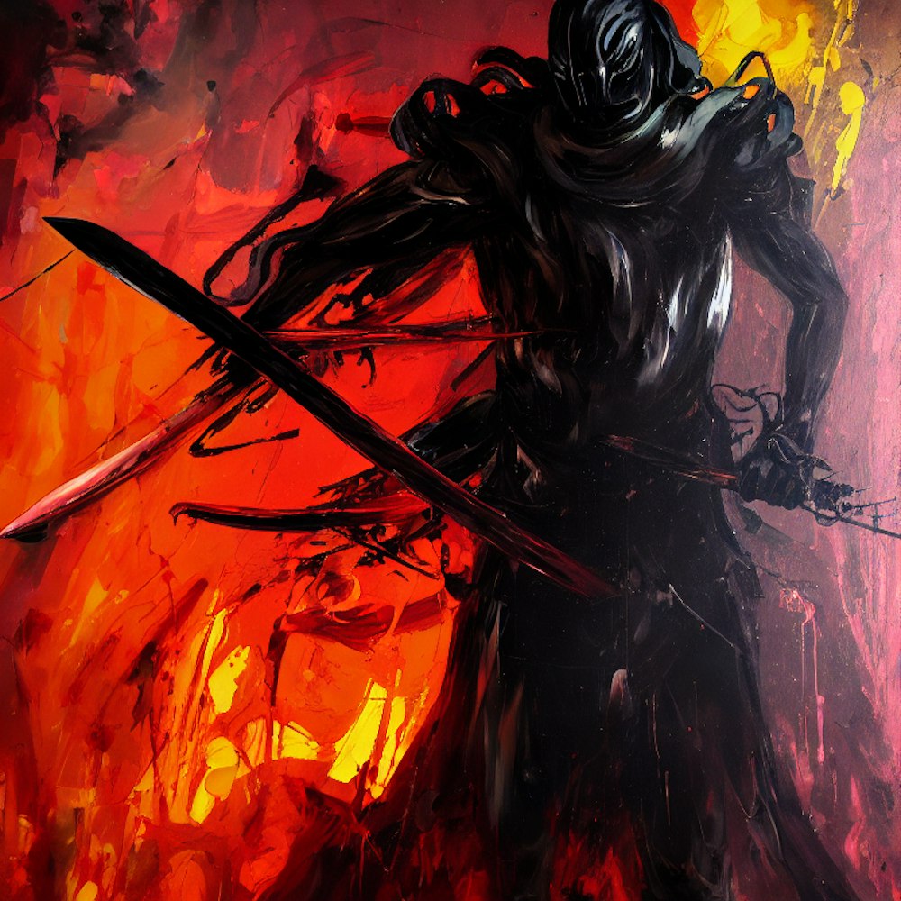 An emotional oil painting of a Shadow figure with a sword, Dark soul boss. Vibrant colors, expressive brushstrokes, Scary composition, intense emotions, allegorical., olpntng style, akihiko yoshida, greg tocchini, greg rutkowsk, oil painting, heavy strokes, paint dripping