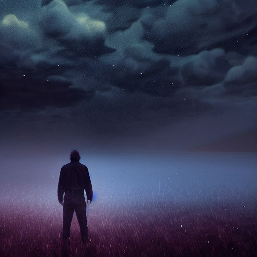 Man in an open field and the rain's pouring down, depressing
