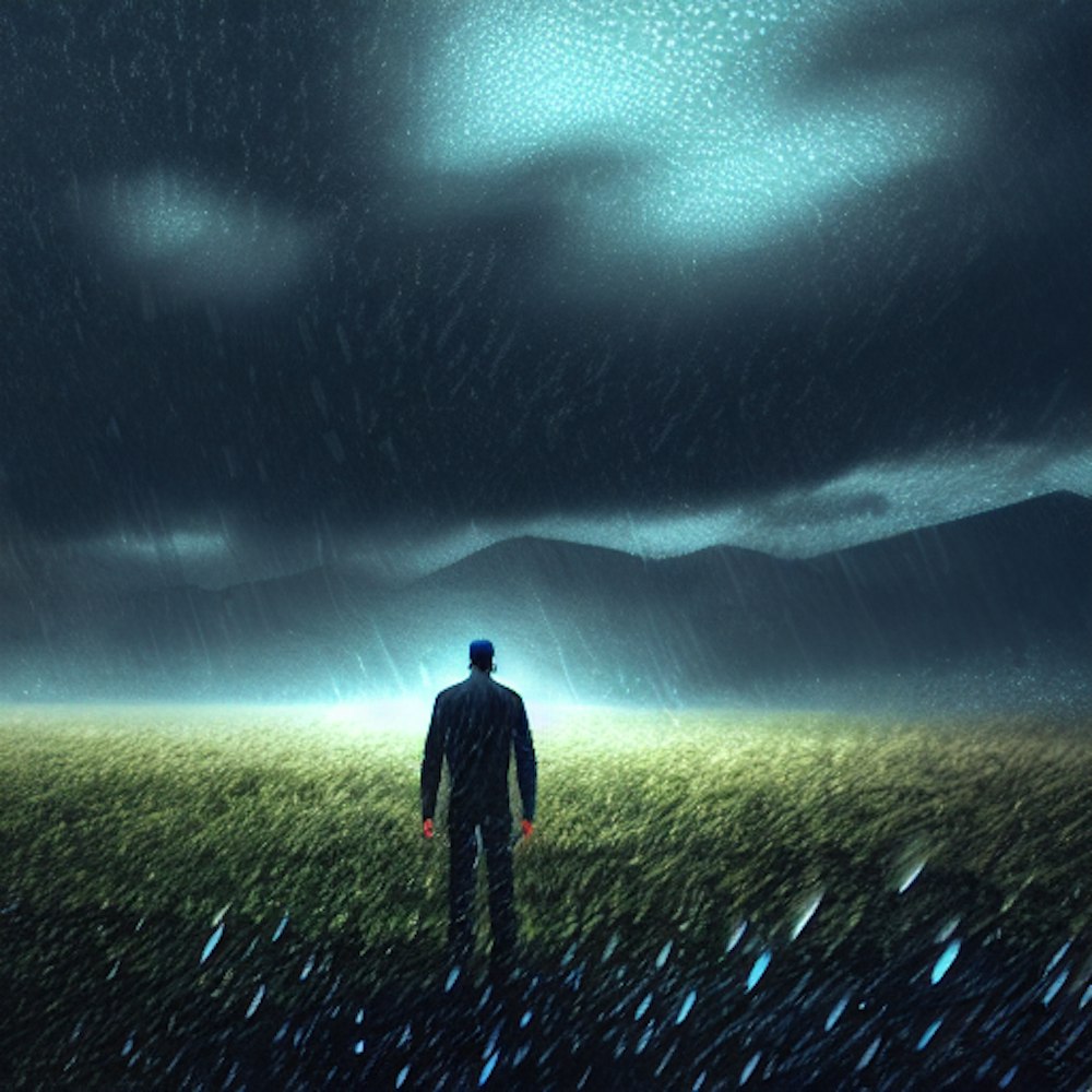 Man in an open field and the rain's pouring down, depressing, HD , hyper detailed, fantasy, masterpiece, detailed