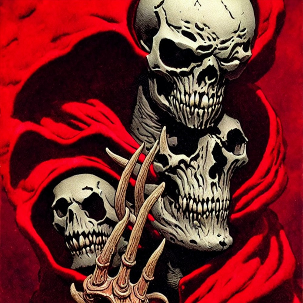 Extreme close up of doom in a red cape, skull face, antlers, + theme of twisted passion, blasphemous game + inspiration from style of moebius, mike mignola, surreal, fever dream, hallucination, nightmare, Gerald Brom, Chesley Bonestell, Zdzisław Beksiński