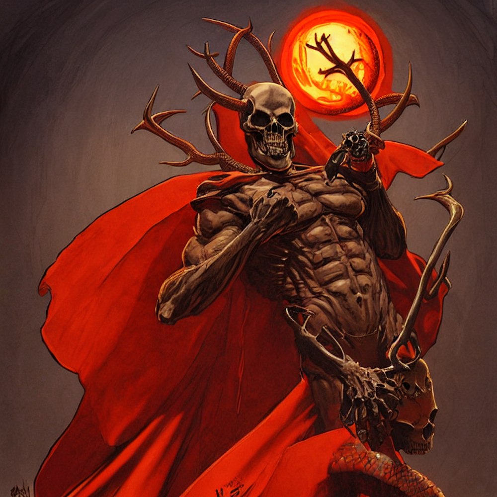 Doom in a red cape, skull face, orange antlers, black staff with snake wrapped around, desert. intricate, Centered. Dittmann, Artgerm, WLOP, Mucha. Concept art. Planets, Space. Dynamic lighting. James Gurney