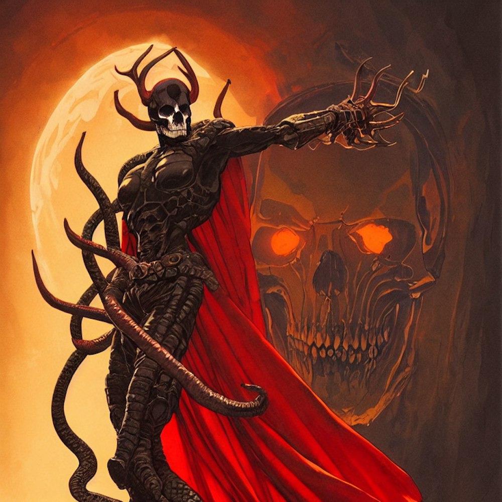 Doom in a red cape, skull face, orange antlers, black staff with snake wrapped around, desert. intricate, Centered. Dittmann, Artgerm, WLOP, Mucha. Concept art. Planets, Space. Dynamic lighting. Regal. Bagshaw, Chevrier, Ferri, Kaluta, Minguez, Johansson