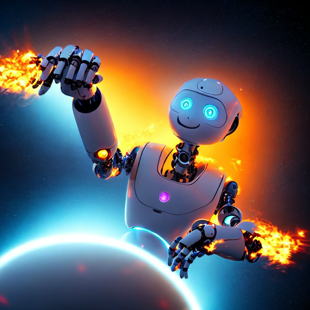animated robot in space on fire singing